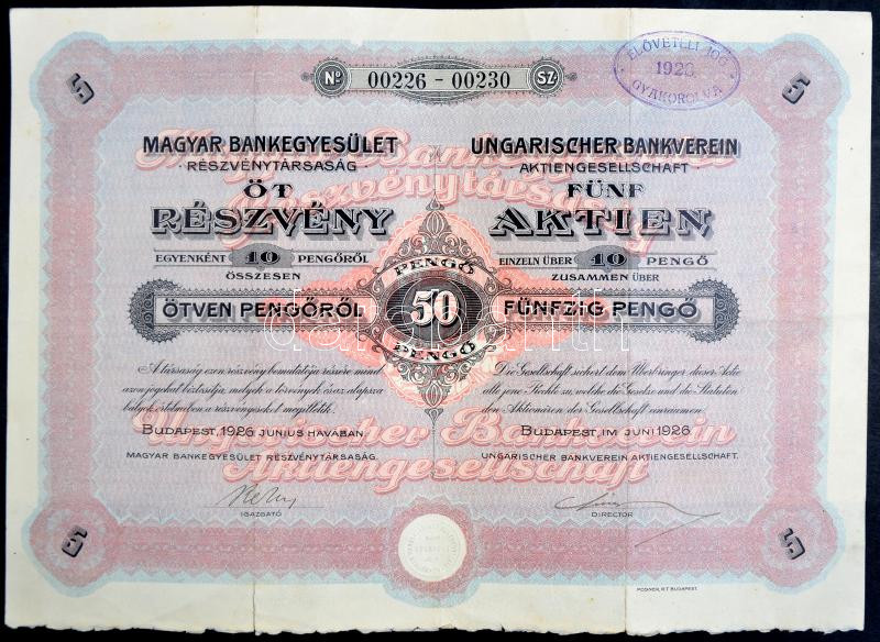 https://www.darabanth.com/en/213-Online-auction/213.0/Numismatics/Shares-and-Tickets~200006/Budapest-1926-Magyar-Bankegyesulet-Reszvenytarsasag-reszvenye-50P-rol-szelvenyekkel-fe~II890422