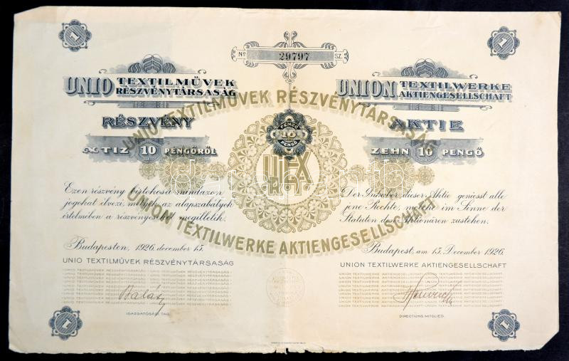 https://www.darabanth.com/en/213-Online-auction/213.0/Numismatics/Shares-and-Tickets~200006/Budapest-1926-Unio-Textilmuvek-Reszvenytarsasag-reszvenye-10P-rol-szarazpecsettel-es-~II890890