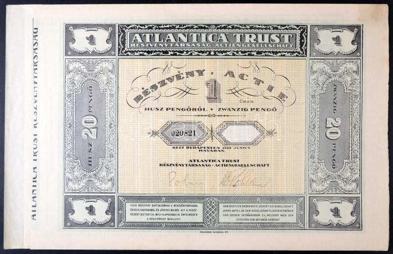 Budapest 1928. "Atlantica Trust Részvénytársaság" részvénye 20P-ről sz...