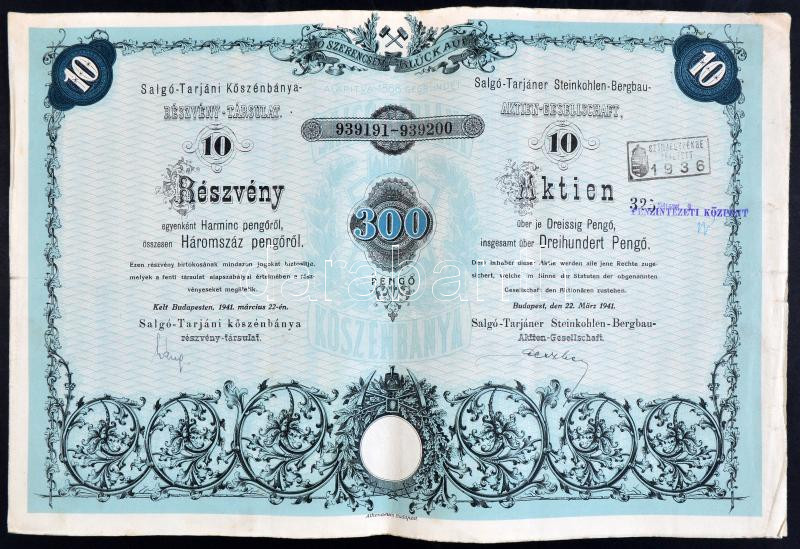 Budapest 1941. "Salgó-Tarjáni Kőszénbánya Részvény-Társulat" 10 részvénye összesen 300P-ről bélyegzéssel, szelvényekkel T:III