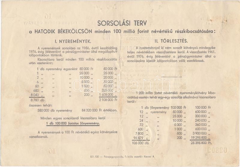 Budapest 1955. "Hatodik Békekölcsön" nyereménykölcsöne 100Ft-ról T:III...