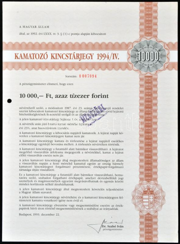 Budapest 1993. Kincstárjegy 10.000Ft-ról "MEGSZŰNT" felülbélyegzéssel T:I-