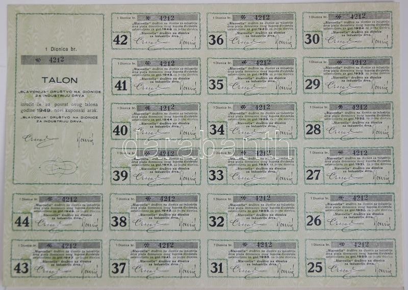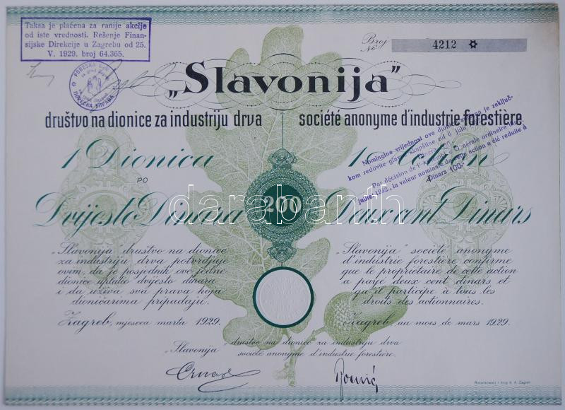 Jugoszlávia / Zágráb 1929. "Slavonija Erdészeti RT." részvénye 200D-ró... https://www.darabanth.com/en/213-Online-auction/213.0/Numismatics/Shares-and-Tickets~200006/Jugoszlavia-Zagrab-1929-Slavonija-Erdeszeti-RT-reszvenye-200D-rol-mindegyik-szelvennye~II615872