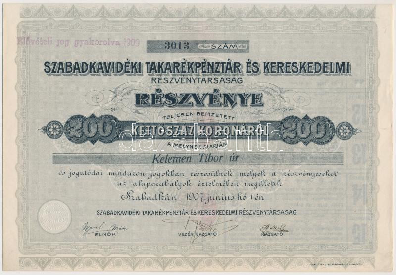 Szabadka 1907. "Szabadkavidéki Takarékpénztár és Kereskedelmi Részvénytársaság" részvénye 200K-ról szelvényekkel, pecsételéssel T:I-