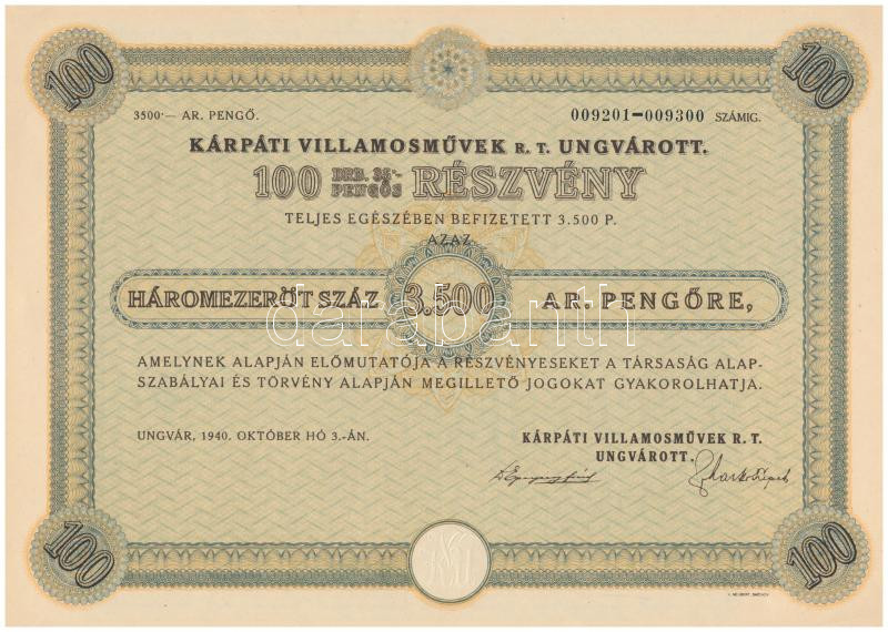 Ungvár 1940. "Kárpáti Villamosművek R.T. Ungvárott" részvénye 3500P-rő...