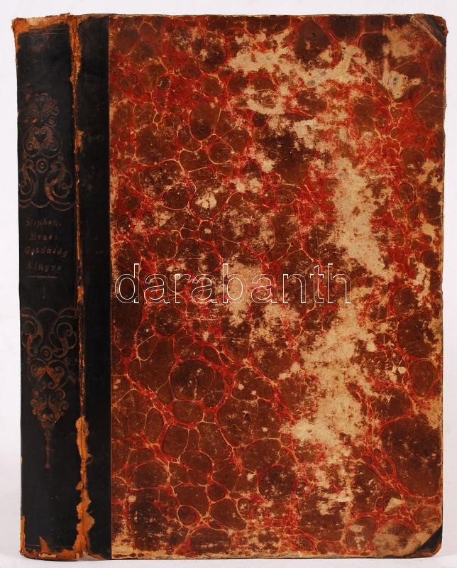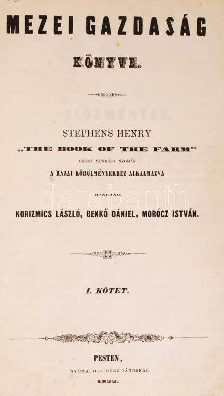 Stephens, Henry: Mezei gazdaság könyve, A hazai körülményekhez alkalmazva, I. kötet. Pest, 1855, Herz János. Aranyozott gerincű félbőr kötés, gerincnél levált, egyes lapok gyűröttek, színezett lapszélek, kopottas állapotban.
