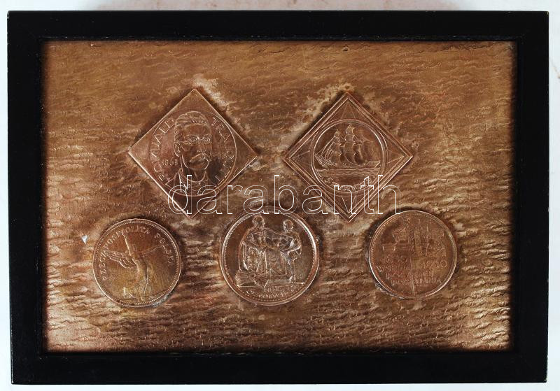 Fa doboz tetején lengyel érmekkel, 19×13 cm