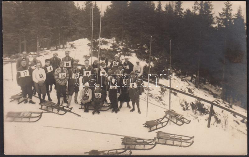 1925 Ó-Tátrafüred, egy szánkóverseny szép emléke, levlap méretű csoportkép a versenyzőkről, feliratozva, 9x14 cm
