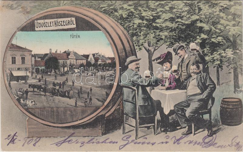 Kőszeg, Fő tér, Kohn Jakab üzlete, borozó társaság, kiadja Róth Jenő (...