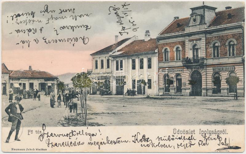 Description: Ipolyság, Fő tér, Neumann Jakab és Herz Adolf utóda üzlete, Bor és sör csarnok, Iparoskör, kiadja Neumann Jakab / square, shops, wine and beer hall (EB)