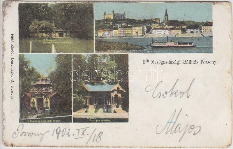 Description: Pozsony, II. Mezőgazdasági kiállítás, Erdészeti és vadászati pavilon, Izabella házi ipar pavilon, II. főcsoport mezőgazdasági termények, gőzhajó / agricultural exhibition, pavilions, steamship (EK)
