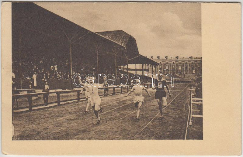 1913 K.A.O.E. verseny; Rákos kifogástalan bedobással győz 100 yardon; Weinreb, Rákos, Boros, Schubert / Hungarian running race