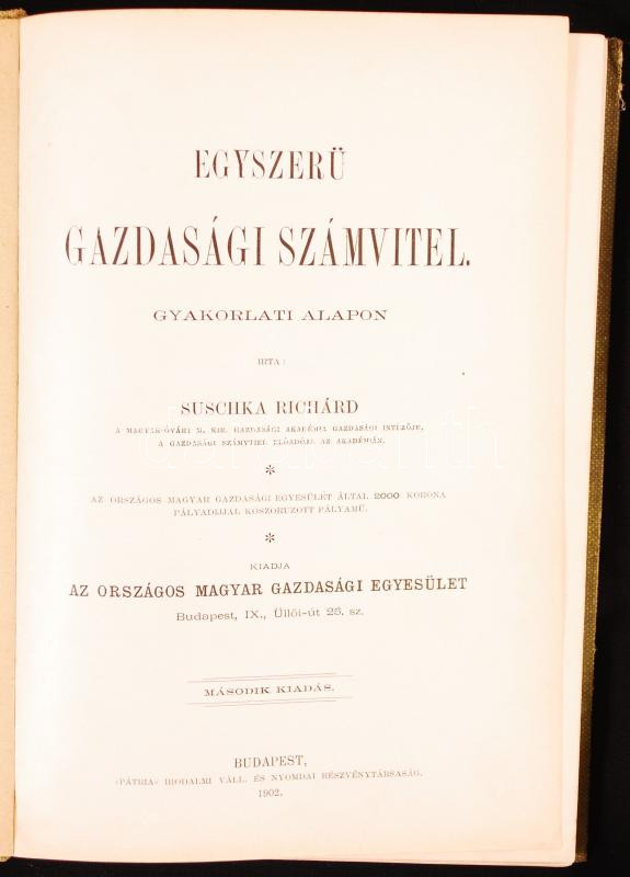 Suschka Richárd: Egyszerű gazdasági számvitel. Bp., 1902. Pátria. 212p. Egészvászon kötésben