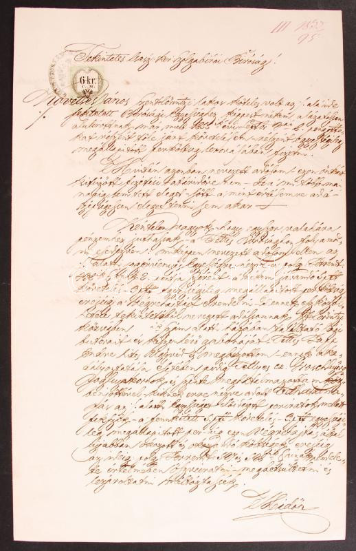 1856 Szentlőrinc szolgabírói bírósághoz beadott okirat adósságrendezés ügyében 6kr CM okmánybélyeggel
