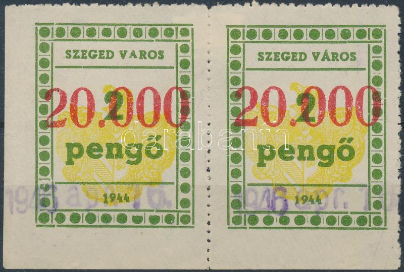 1946 Szeged városi illetékbélyeg 20.000P/2P párban, egyiken kis "A" betű tévnyomat (az ív 7. helyén)