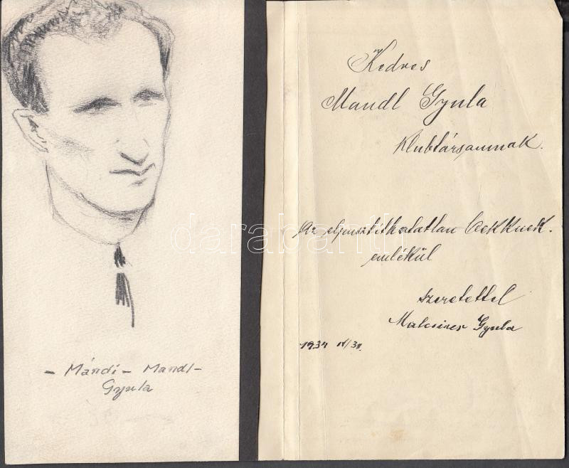 Description: 1934 Sporttörténeti lelet: Mándi Gyula (1899-1969) labdarúgónak, edzőnek írt vers, róla készült grafikus portré, a verset Malcsiner Gyula MTK-beli klubtársa írta