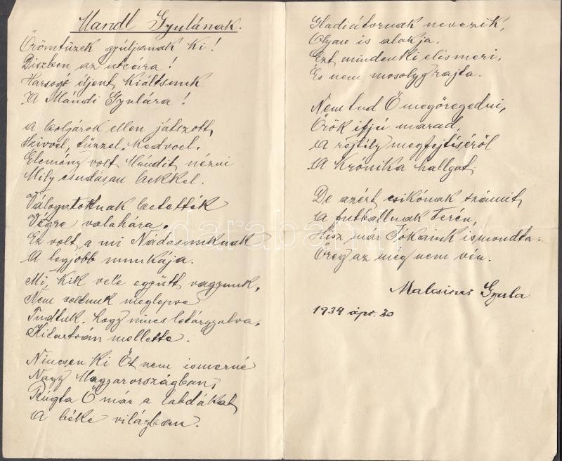 1934 Sporttörténeti lelet: Mándi Gyula (1899-1969) labdarúgónak, edzőn... https://www.darabanth.com/en/214-Online-auction/214.0/Other-collectibles/Historical-documents-manuscripts~19/1934-Sporttorteneti-lelet-Mandi-Gyula-1899-1969-labdarugonak-edzonek-irt-vers-rola-kes~II893529