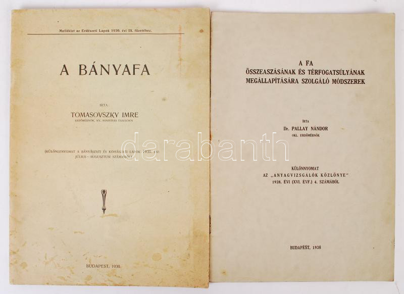 Description: 2 db fákkal kapcsolatos kiadvány-Dr. Pallay Nándor: A fa összeaszásának és térfogatsúlyának megállapítására szolgáló módszerek. Bp., 1938.; Tomasovszky Imre: A bányafa. Bp., 1930. Kiadói papírkötés, kopottas állapotban.