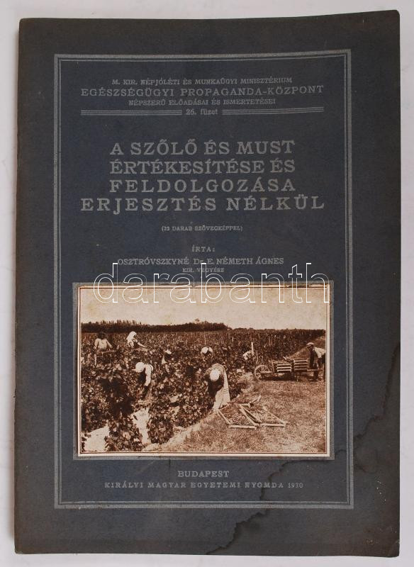 Description: Osztróvszkyné Dr. E Németh Ágnes: A szőlő és must értékesítése és feldolgozása erjesztés nélkül. Egészségügyi Propagandaközpont. Bp., 1930, Királyi Magyar Egyetemi Nyomda. Kiadói papírkötés, kopottas állapotban.