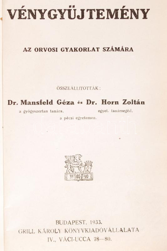 Description: Dr. Mansfeld Géza és Dr. Horn Zoltán(szerk.): Vénygyűjtemény az orvosi gyakorlat számára. Bp., 1933, Grill Károly Könyvkiadóvállalata. Kiadói egészvászon kötés, kopottas állapotban.