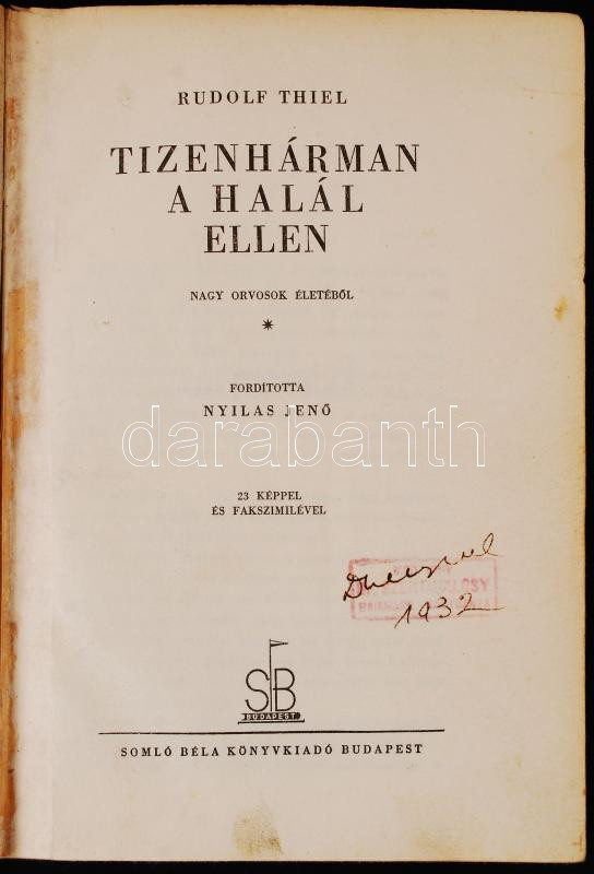 Rudolf Thiiel: Tizenhárman a halál ellen. Nagy orvosok életéből. 23 képpel és fakszimilével. Bp. é.n. Somló Béla. Egészvászon kötésben