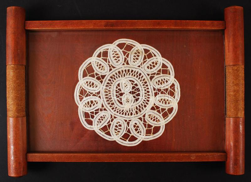 Masszív fa tálca, üvegezett csipke terítővel, 31×43 cm