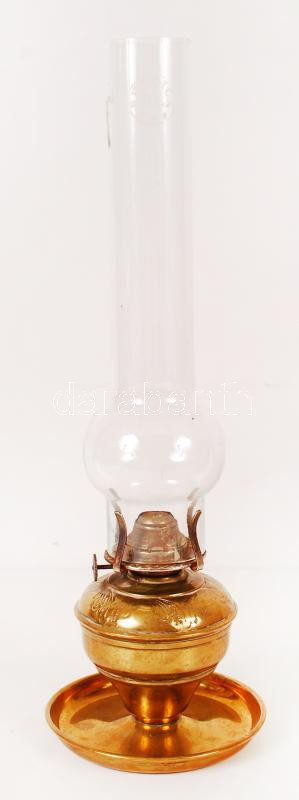 Réz petróleumlámpa, jelzett (Belgica) üvegburával, m:37 cm