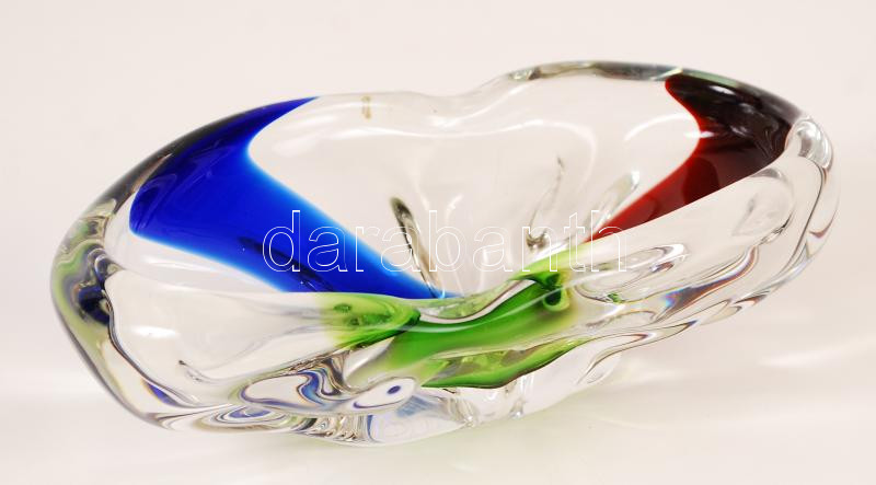 Többszínű üveg asztali tál, apró hibával, 19x11x6 cm