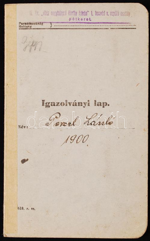 1938 M. kir. "vitéz nagybányai Horthy István" 1. honvéd v. repülő osztály által kiállított igazolványi lap