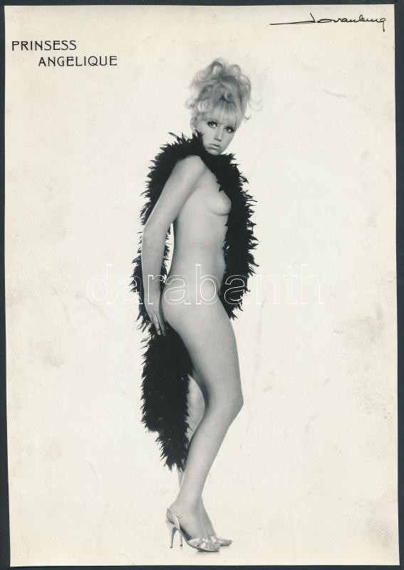 Description: cca 1960 J. van Tsuggenhaut (Brüsszel): Angélika, a szriptíztáncosnő, pecséttel jelzett, finoman erotikus reklámfotó, 24x16 cm /