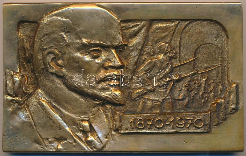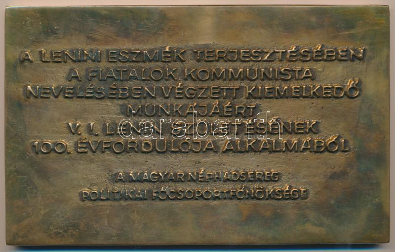 Description: 1970. "A Lenini eszmék terjesztésében a fiatalok kommunista nevelésében végzett kiemelkedő munkájáért V. I. Lenin születésének 100. évfordulója alkalmából a Magyar Néphadsereg Politikai Főcsoportfőnöksége" nagyalakú bronz plakett eredeti adományozói dísztokban T:1