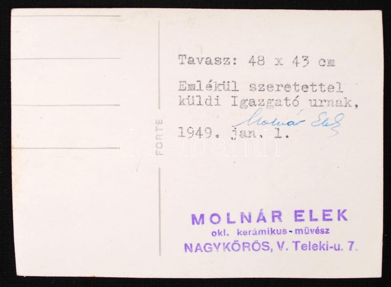 1949 Molnár Elek (1916) keramikus művész Tavasz című munkájának fotója, hátoldalt a művész soraival és aláírásával