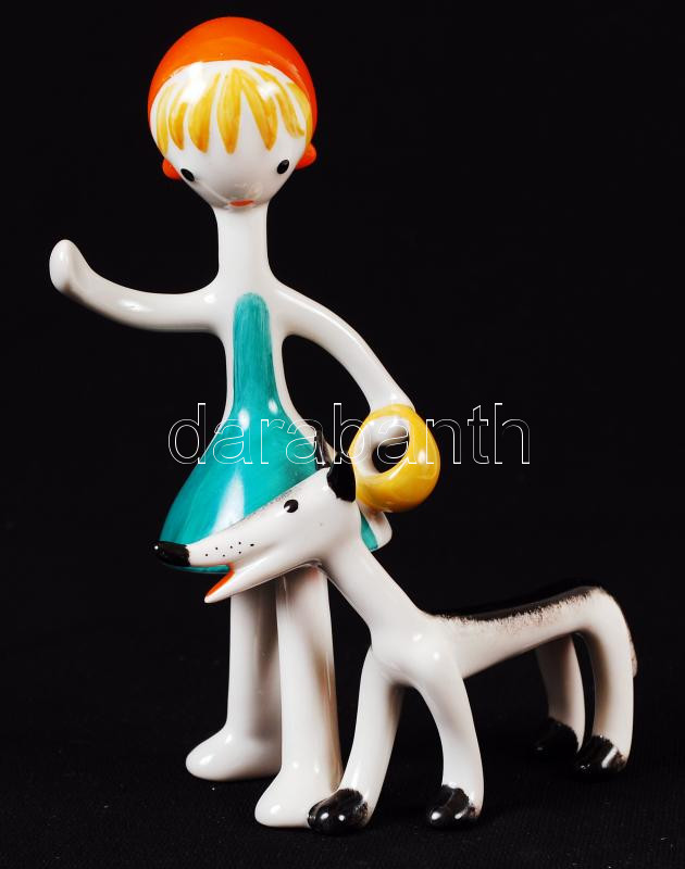 Hollóházi kislány a kutyával, kézzel festett, jelzett, hibátlan, m:14 ...
