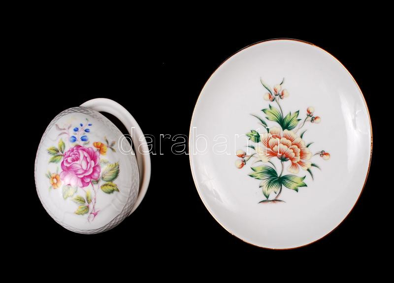 Hollóházi tojás és tálka, matricás, jelzett, hibátlan, 6×4 cm, 10×12 c...