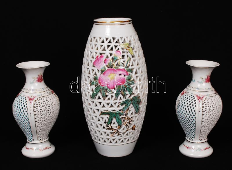 Kínai áttör vázák (3db), kézzel festett, jelzés nélkül, hibátlanok, m:15 (2×), m:21 cm