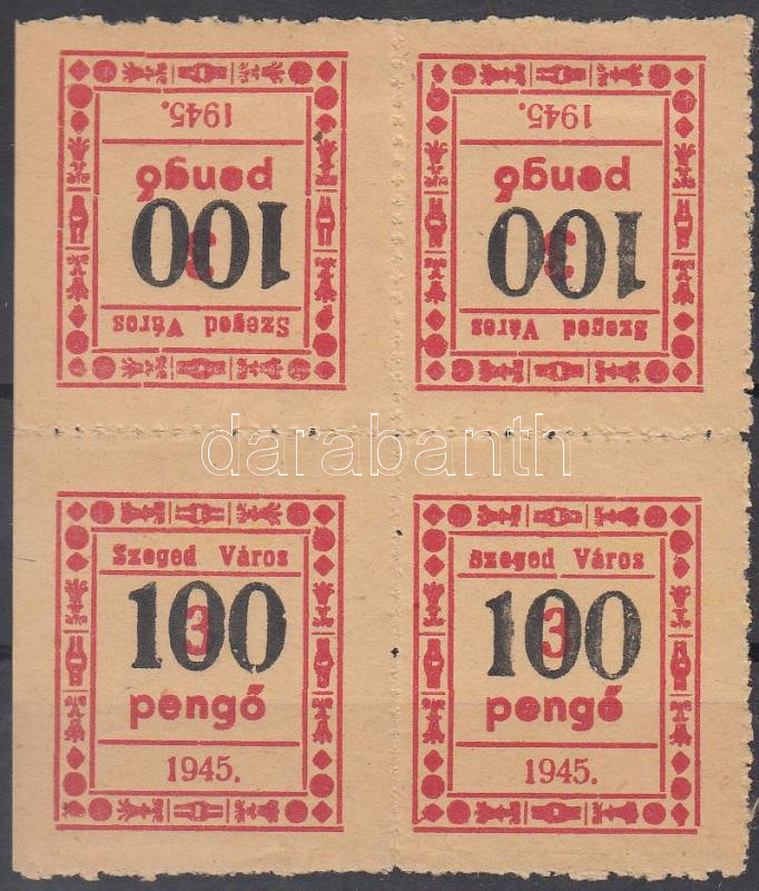 1945 Szeged városi illetékbélyeg 100/3P négyestömb fordított párral (ritka)