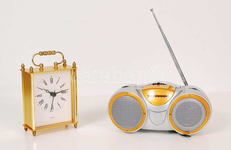 AM/FM Stereo sárga-ezüst színű rádió (FM 88-108 Mhz / AM 530-1600 Khz) és egy art deco stílusú asztali óra