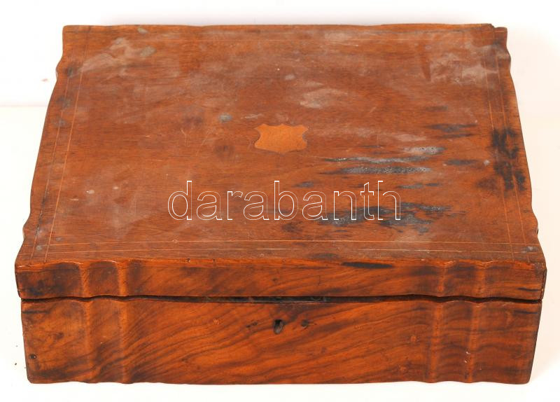 Antik asztali doboz, közepes állapotban, sérüléssel, kulcs nélkül, 23×29 cm