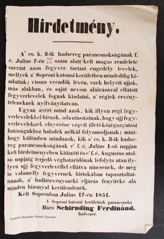 1851 Sopron, Schrinding Ferdinánd császári tábornok fegyverviselési engedélyéket szabályozó hirdetménye 24x36 cm