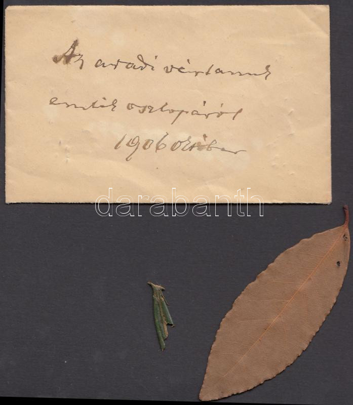 1906 Az aradi vértanúk emlékoszlopának babérkoszorújából félretett levéldarabok feliratozott borítékban