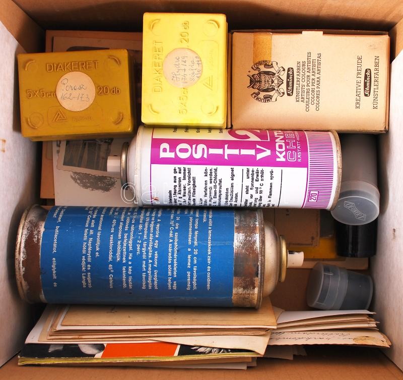 Nagy doboznyi fotók és fotós kellékek ( pl: retusáló festék, fotólakk, fotós könyvek, diák stb...)