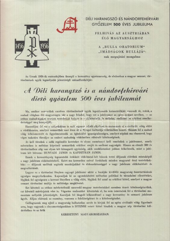 1956 Felhívás a Nándorfehérvári győzelem 500. évfordulójának megünneplésére, és Mo-i. elnyomás ellen Magyarok Szövetsége Ausztria