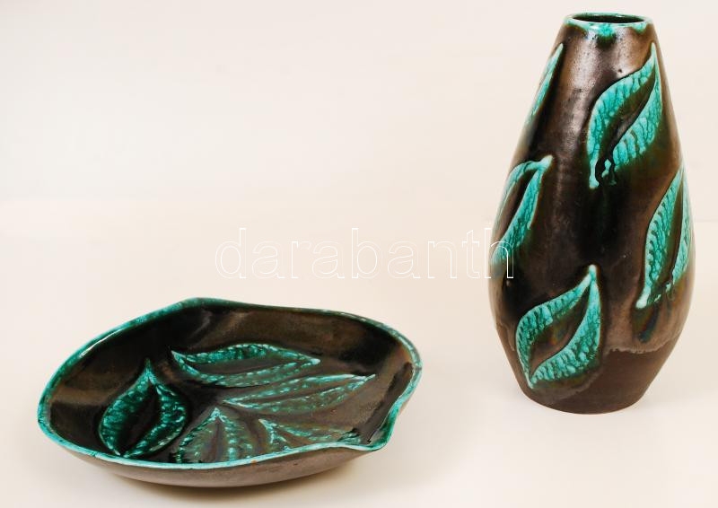 EBM jelzésű fekete-zöld kerámia váza és asztali dísztál, apró mázhibáv...