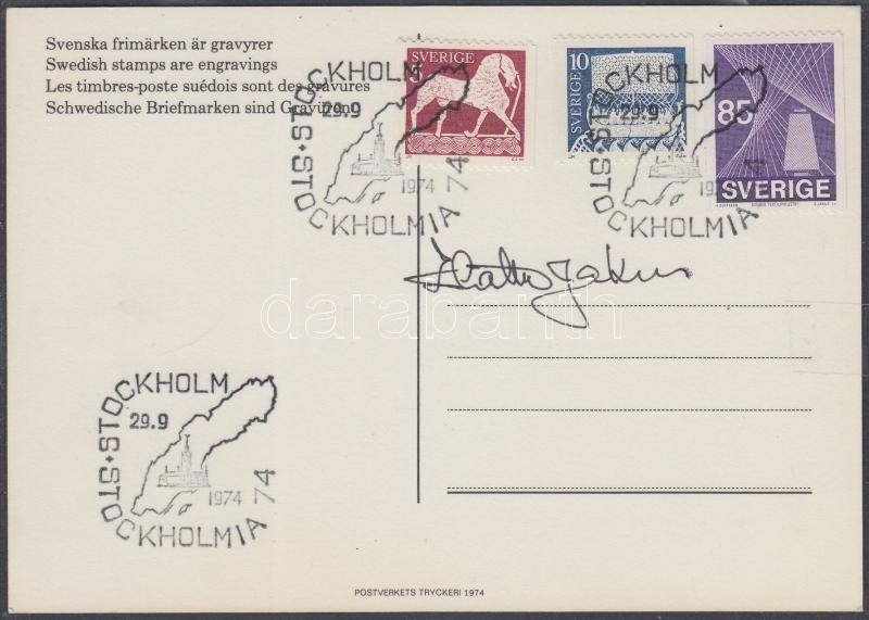 Z. Jakus bélyegtervező aláírása levelezőlapon rajta az által tervezett bélyegekkel