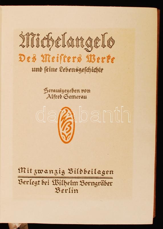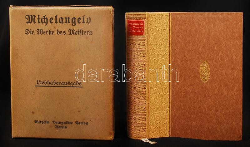 Description: Michelangelo. Des Meisters Werke und seine Lebensgeschichte. Szerk.: Gemerau, Alfred. Berlin, [1920], Wilhelm Vorngräber. Aranyozott félbőr kötésben, papír védőtokkal, jó állapotban.