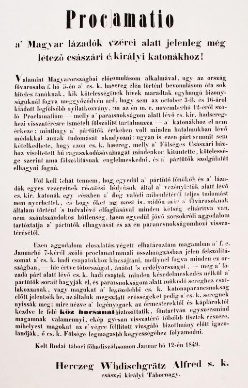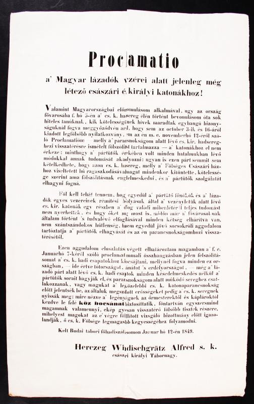 1849 Windisgrätz Alfréd herceg (1787-1862) az osztrák sereg fővezérének magyar nyelvű proklamációja a Magyar lázadók vezérei alatt jelenleg még létező császári és királyi katonákhoz