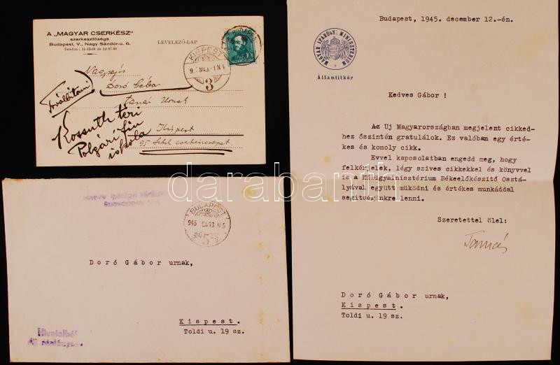 1945 Dóró Gábor cserkészvezetőnek szóló levél az igazságügy minisztérium államtitkárától, melyben gratulál egy cikkel kapcsolatban + egy másik cserkész témájú levél