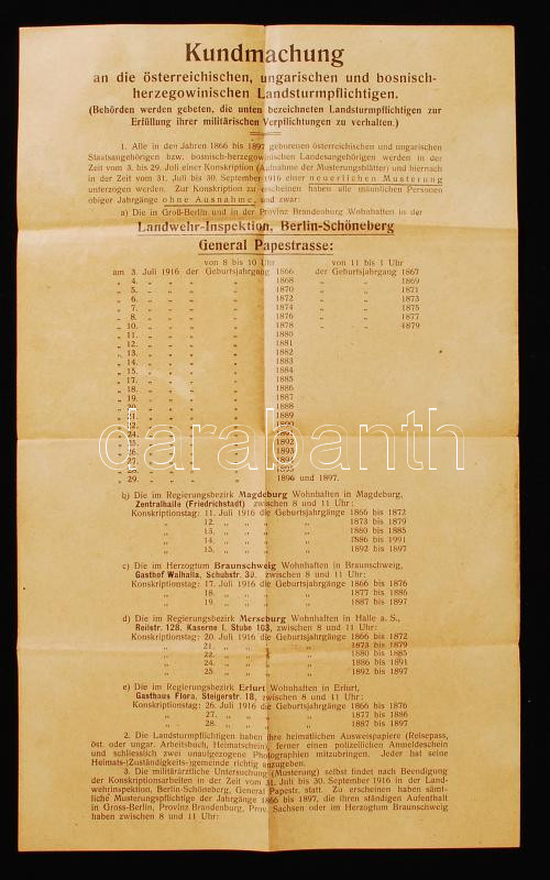1916 A Németországban tartózkodó Osztrák-Magyar monarchiabeli lakosok ... https://www.darabanth.com/en/218-Online-auction/218.0/Other-collectibles/Military~200008/1916-A-Nemetorszagban-tartozkodo-Osztrak-Magyar-monarchiabeli-lakosok-sorozasarol-ertesitC5~II926292