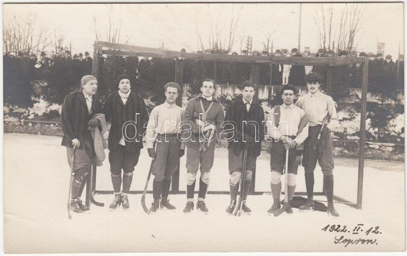 1922. február 12. Schäffer Ármin: Sopronban játszott budapesti hokicsapat, névsor a hátoldalon, fotólap, 9x14 cm