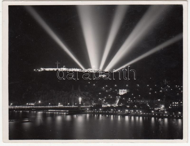 Dulovits Jenő (1903-1972): Budapest éjszaka, a Citadella sugárzó fénycsóvái, éjszakai felvétel, pecséttel jelzett vintage fotó, 9x12 cm